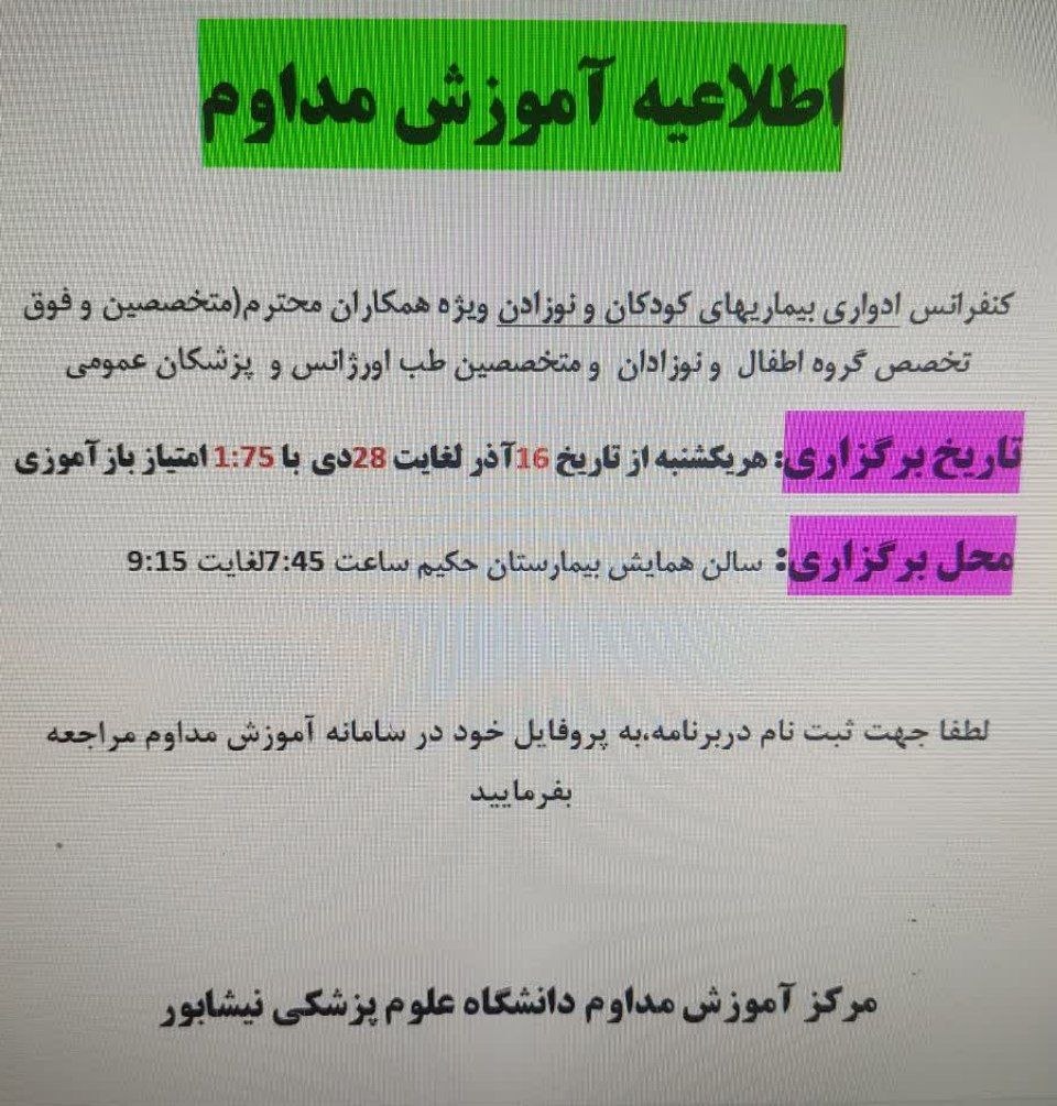 اطلاعیه آموزش مداوم ═════❁💠❁═════کانال جدید خبری تلگرامی سازمان نظام پزشکی نیشابور:https://t.me/nezamneyshabourr