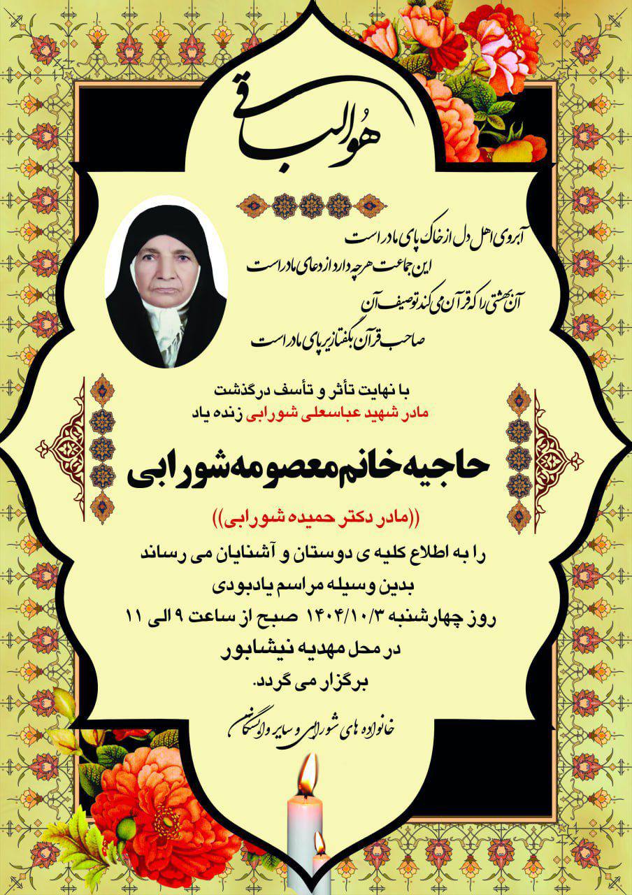 ⚫️پیام تسلیتشعلهای خاموش گشت و خانهای بینور شدگوهر ارزندهای پنهان به خاک گور شدمادری شایسته از این عالم ناپایدارچشم خود بربست و از چشم عزیزان دور شد_مادرِ خانم دکتر حمیده شورابی (داروساز)_مادر بزرگ خانمِ دکتر محدثه شورابی (طب اورژانس)همکاران بزرگوار ضایعه درگذشت مهربان مادر عزیز و بزرگوارتان را از صمیم قلب تسلیت عرض می نماییم .═════❁💠❁═════کانال جدید خبری تلگرامی سازمان نظام پزشکی نیشابور:https://t.me/nezamneyshabourr